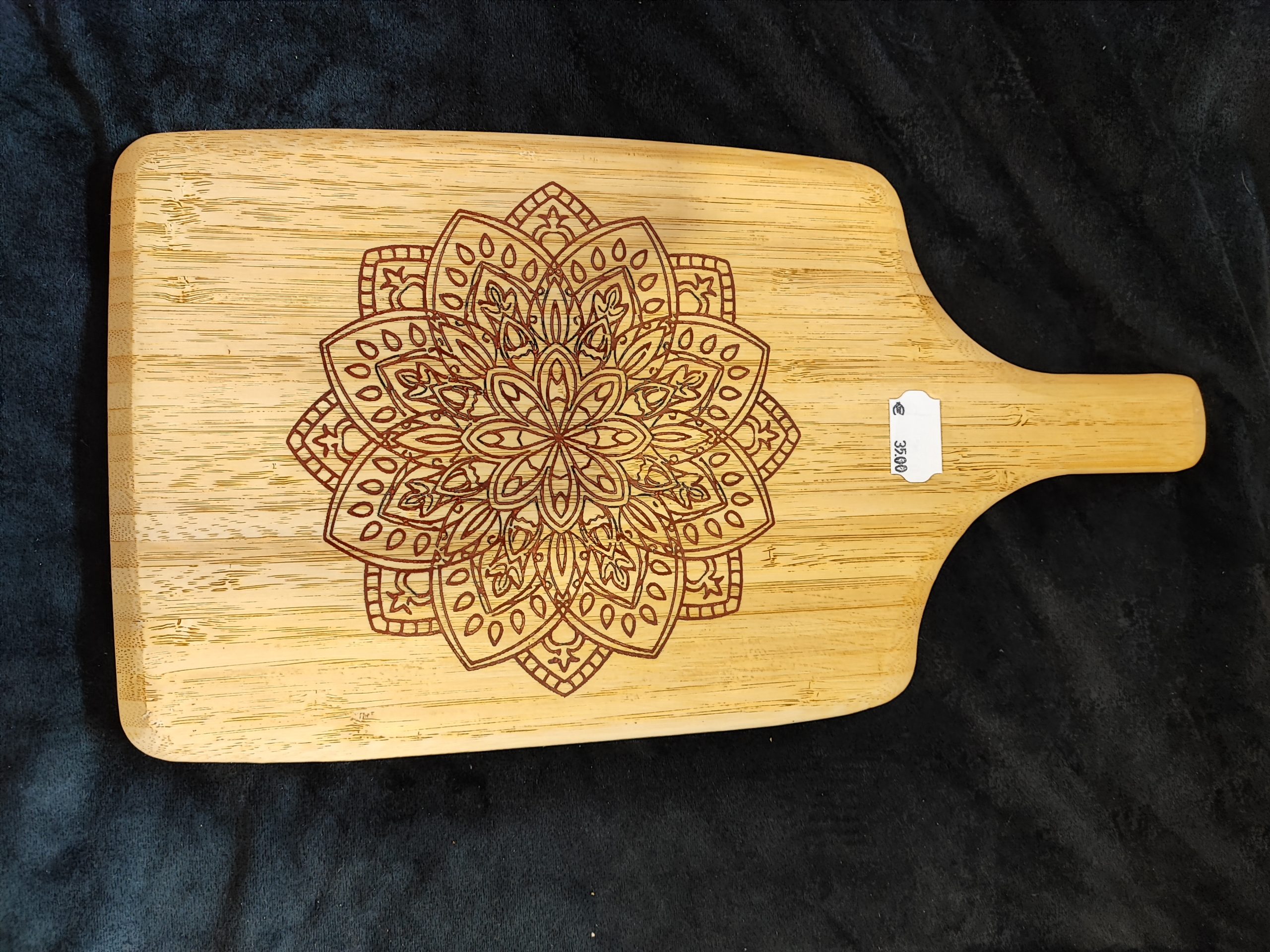 Planche de présentation alimentaire en bambou de 38cm de long avec manche, réalisé grâce à la méthode de gravure et remplie de résine époxy. Chaque pièce est originale et met en valeur vos aliments avec élégance et caractère. La planche est protégée par un vernis spécial alimentaire ou huile alimentaire suivant les pièces, garantissant une utilisation sûre pour le service de fromages, charcuteries, pains ou amuse-bouche.