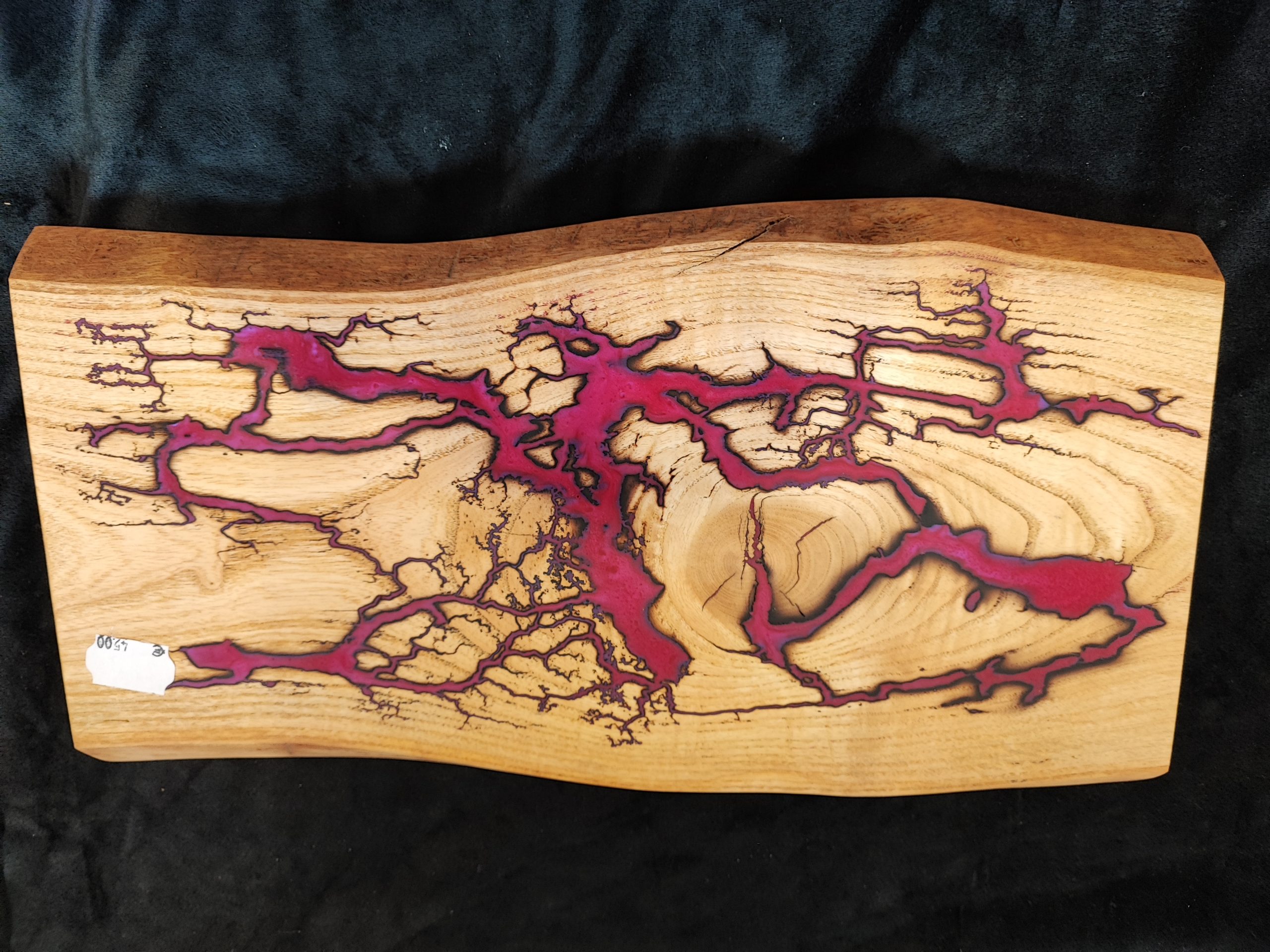 Planche de présentation alimentaire en frêne de 40cm de long, réalisé grâce à la méthode fractal de Lichtenberg*. Chaque pièce est originale et met en valeur vos aliments avec élégance et caractère. La planche est protégée par un vernis spécial alimentaire ou huile alimentaire suivant les pièces, garantissant une utilisation sûre pour le service de fromages, charcuteries, pains ou amuse-bouche.