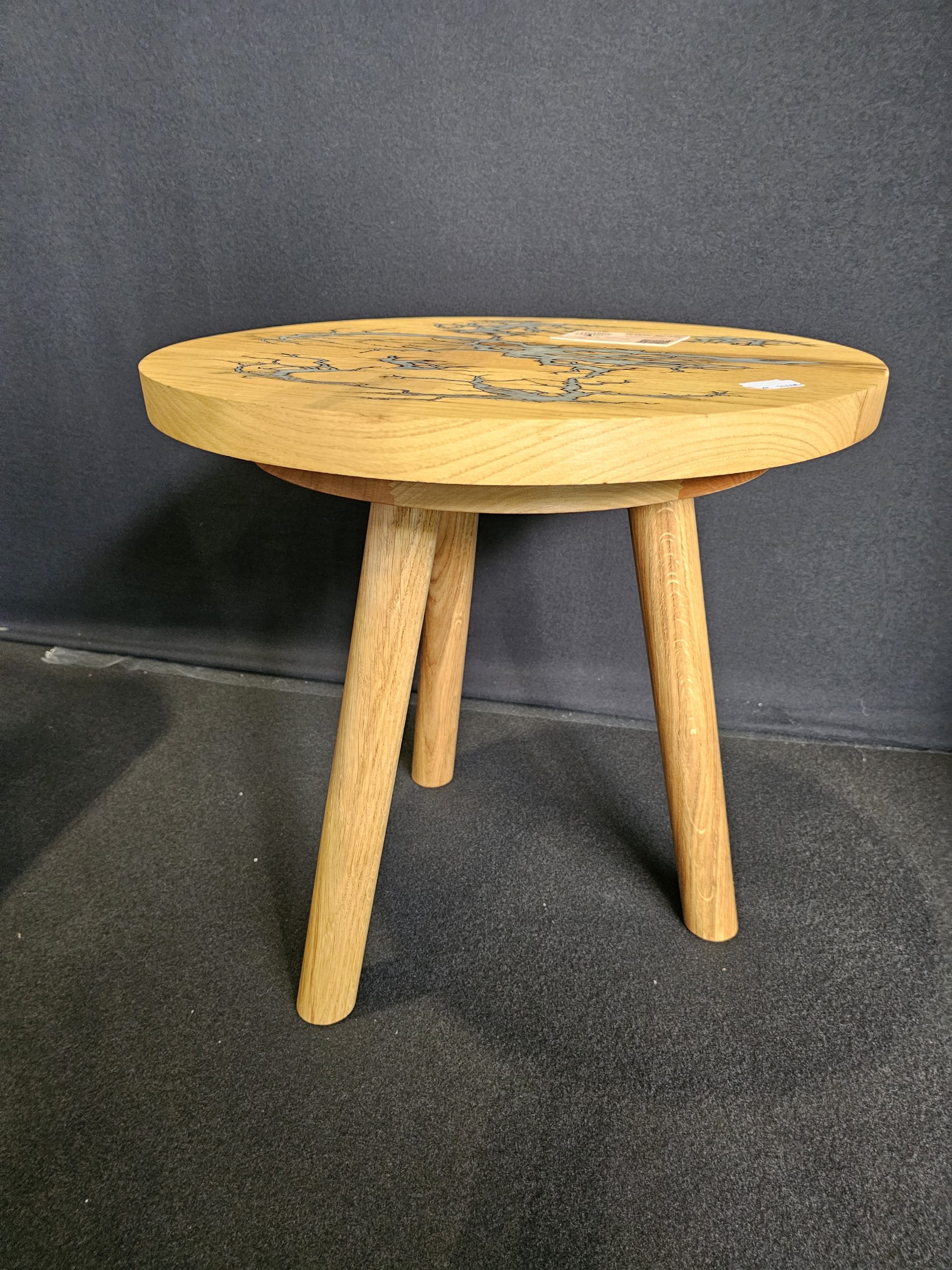 Table basse ou tête de canapé ronde en chêne massif, au design unique et contemporain. Dimensions : 45 cm de diamètre, 45 cm de hauteur, avec un plateau de 26 mm d’épaisseur et des pieds soigneusement tourné au tour à bois puis assemblé afin d’avoir un ensemble harmonieux. Le plateau est sublimé par la technique du fractal de Lichtenberg, soigneusement rempli de résine époxy grise la pièce est totalement unique. Une création artisanale qui apporte caractère et originalité à votre intérieur.